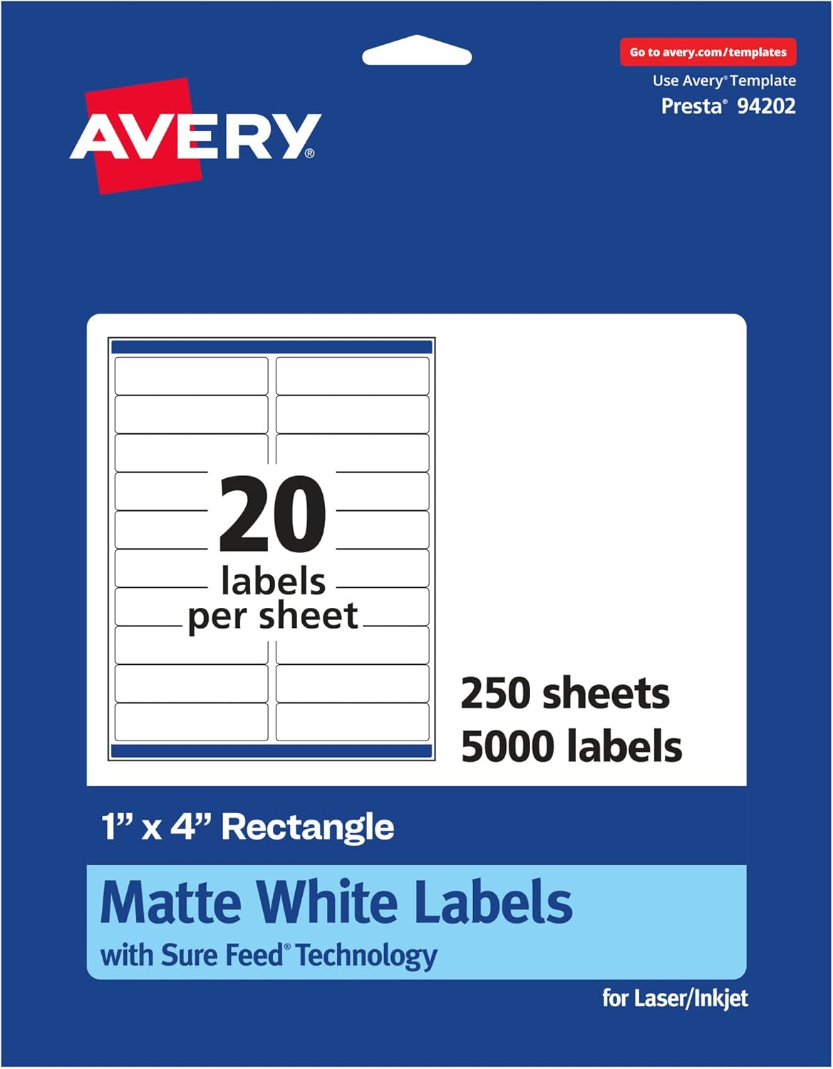 Avery Matte White Rectangle Labels, Sure Feed Technology, 1" x 4", 1,000 Matte White Printable Labels