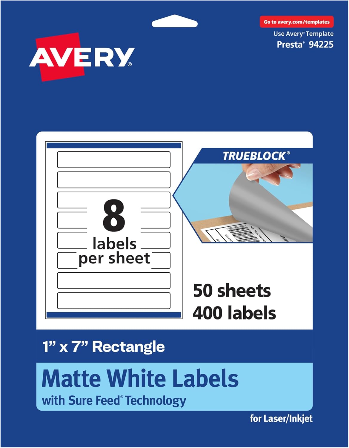 Easily update old information and create candle labels, cosmetic labels, jar labels, and more with Avery TrueBlock 1" x 7" Matte White Rectangle Labels. Easily revise old labels with Avery TrueBlock technology. The proprietary TrueBlock feature completely covers up markings and printing so that none of your old data shows through. This also provides better contrast for your new print to stand out on a completely white background. The permanent adhesive makes sure that your labels stick and stay to a variety of surfaces without peeling, curling, or falling off. Avery rectangle labels are carefully constructed with top features to provide the best results. Sure Feed technology reduces jams and smudges by creating a more reliable feed through your printer. The print-to-the-edge layout lets you print beautiful full-bleed designs that fill each blank sticker to the edge. Easily customize body butter labels, soap labels, tamper-evident seals, and more with your own art, symbols, and messaging by using the templates and designs on the Avery website.