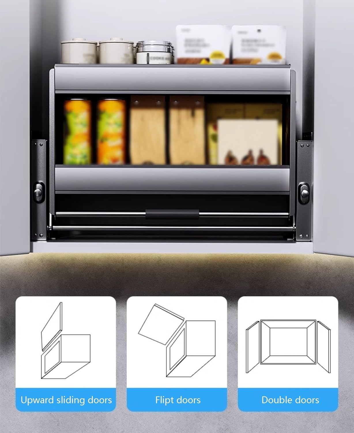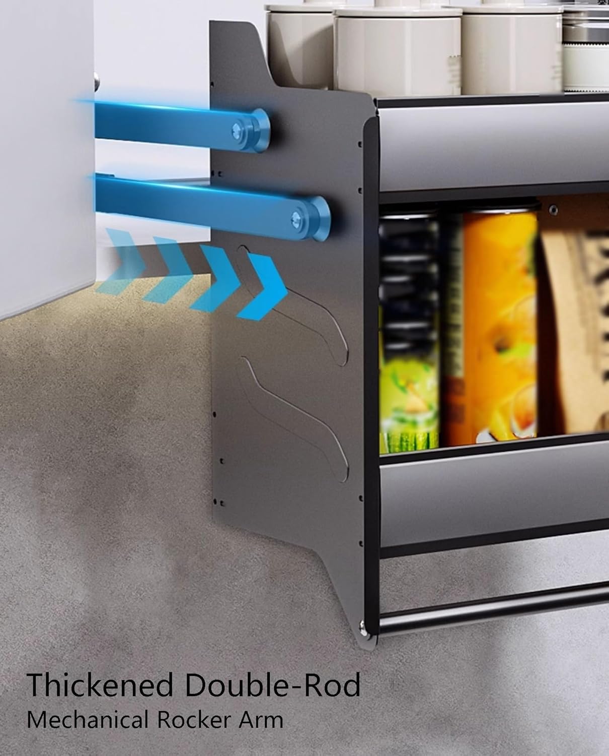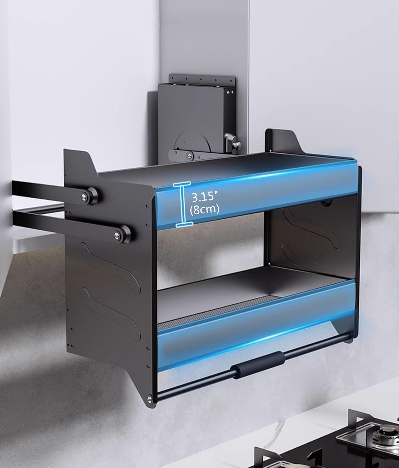 We will help you keep your jars tidy and easy to locate while also maximizing the usable space in your kitchenNon-slip Handle: The humanized handle with a silicone wrap gives you a comfortable gripRaised guard rails at the front and rear can prevent items from falling, making it more secure to placeLift Stable: The connecting rod makes the left side and right side lifting smooth and stable● Specification:Material: Aluminum alloy and 304 stainless steelSuitable Inner Height of Wall Cabinet:>21.7"(55cm)Suitable Inner Depth of Wall Cabinet: >11.8"(30cm)Suitable Inner Width of Wall Cabinet: 14.2"-16.1"(36-41cm), 18.1"-20.1"(46-51cm), 22.1"-24"(56-61cm), 26"-28"(66-71cm), 29.9"-31.9"(76-81cm), 33.9"-35.8"(86-91cm)Product Size: 14.3"x10.6"x21.7" , 18.2"x10.6"x21.7" , 22.2"x10.6"x21.7" , 26.1"x10.6"x21.7" , 30"x10.6"x21.7" , 34"x10.6"x21.7"Adjustable Load-bearing Capacity: 0-4.4lbs(0-2kg), 4.4-11lbs(2-5kg), 11-15.4lbs(5-7kg), 15.4-26.5lbs(7-15)● Notes: 1. Please make sure that your cabinet size is suitable before purchasing2. Please do not control buttons when the basket is moving. Please control the buttons after they go back cabinet3. Please do not use hard tools to clean the shelf, which may scratch the surface of the product and affect its appearance of it4. Please allow the slight color difference caused by the shooting light and 1-3cm error due to manual measurement, and make sure you do not mind before you order