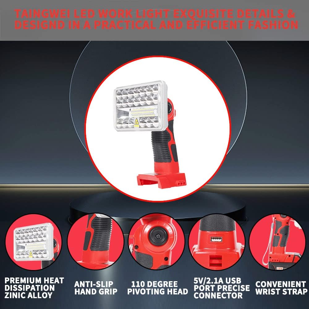 Why choose us -----We are a professional power tool manufacturer, specializing in designing and manufacturing various power tool chargers and adapters. -----Taingwei products are made of the highest quality materials and meet safety testing standards. -----100% battery compatibility.Will not damage the battery. -----CE FCC RoHS certified products to ensure safety. Behind the high-quality products is our professional technical support and timely customer service. Please rest assured to order. Specification: Power: 18W Voltage: 14.4-18V Material: ABS & Zinc Alloy Lumen : 2000LM USB Output: 5V 2.1A Certification: CE & FCC Battery Compatibility: For Milwaukee 18V M18 Lithium Ion Batteries 48-11-1811, 48-11-1815, 48-11-1820, 48-11-1822, 48-11-1828, 48-11-1840, 48-11-1841, 48-11-1850 and More. OPERATE METHOD Press Switch Button Once for 50% White Brightness Press Twice for 100% White Brightness Press the Third Time for 100% White Strobing Long Press to Turn off the Light in Any Mode Package Included: 1 * 18v 18W 2000LM LED Work Light(battery not included)