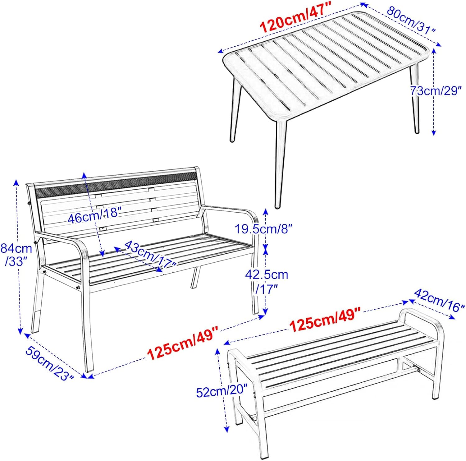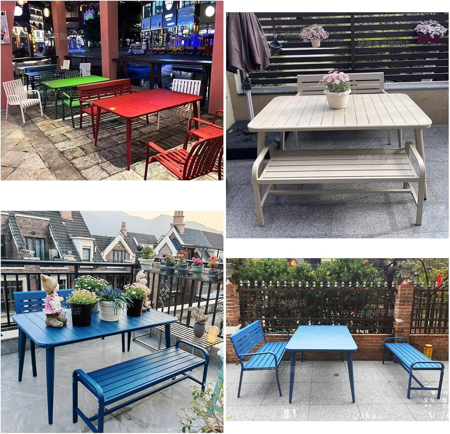 LLZJDDPLY Outdoor patio table and chairsIt accompanies you as you sip coffee on spring mornings, the tabletop cool with dew; it serves as a gathering center on summer evenings, the sweet aroma of lemon soda lingering among the rattan cushions; it is also a small theater on autumn afternoons, where children bend over the table to sketch, fallen leaves rustling at their feet; they will become flowing works of art in the garden.Specifications:Material: aluminum alloyColor:Blue , Green , Red , Beige , Black(Other colors can be customized, please contact me through Amazon)Size: 1 x table L 120/150 x W 80/90 x H 73 cm (L 47/59 x W 31/35 x H 29 in)1 x Double patio chair L 125 x W 59 x H 84 cm (L 49 x W 23 x H 33 in)1 x Double bench: L 125 x W 42 x H 52 cm (L 49 x W 16 x H 20 in)Notice:150cm table can fit two double benches under the table (120cm table cannot fit two double benches)Weight Capacity: 500 kg/1102 lbsPackage Includes:You will receive 3 packages, they may not arrive at the same time1 x Table1 x Double patio bench with backrest1 x Double bench1 x Installation kit